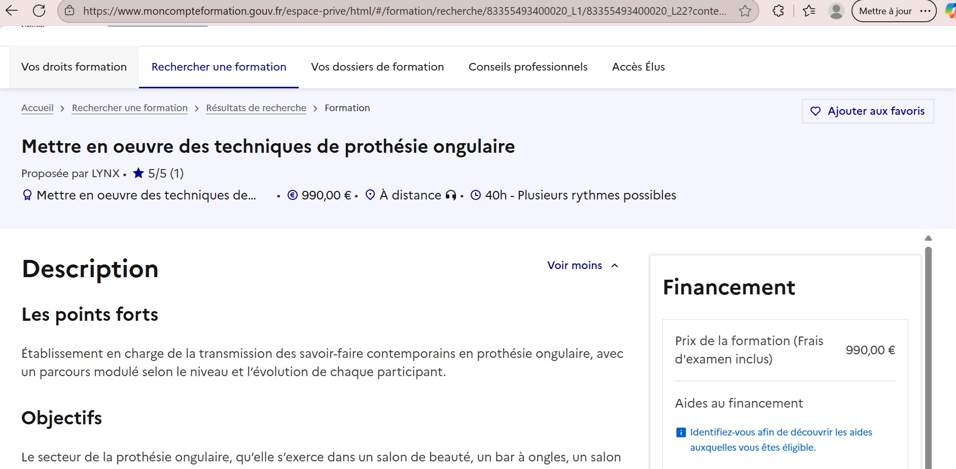 Fiche formation — description, prix et bloc « Financement ».