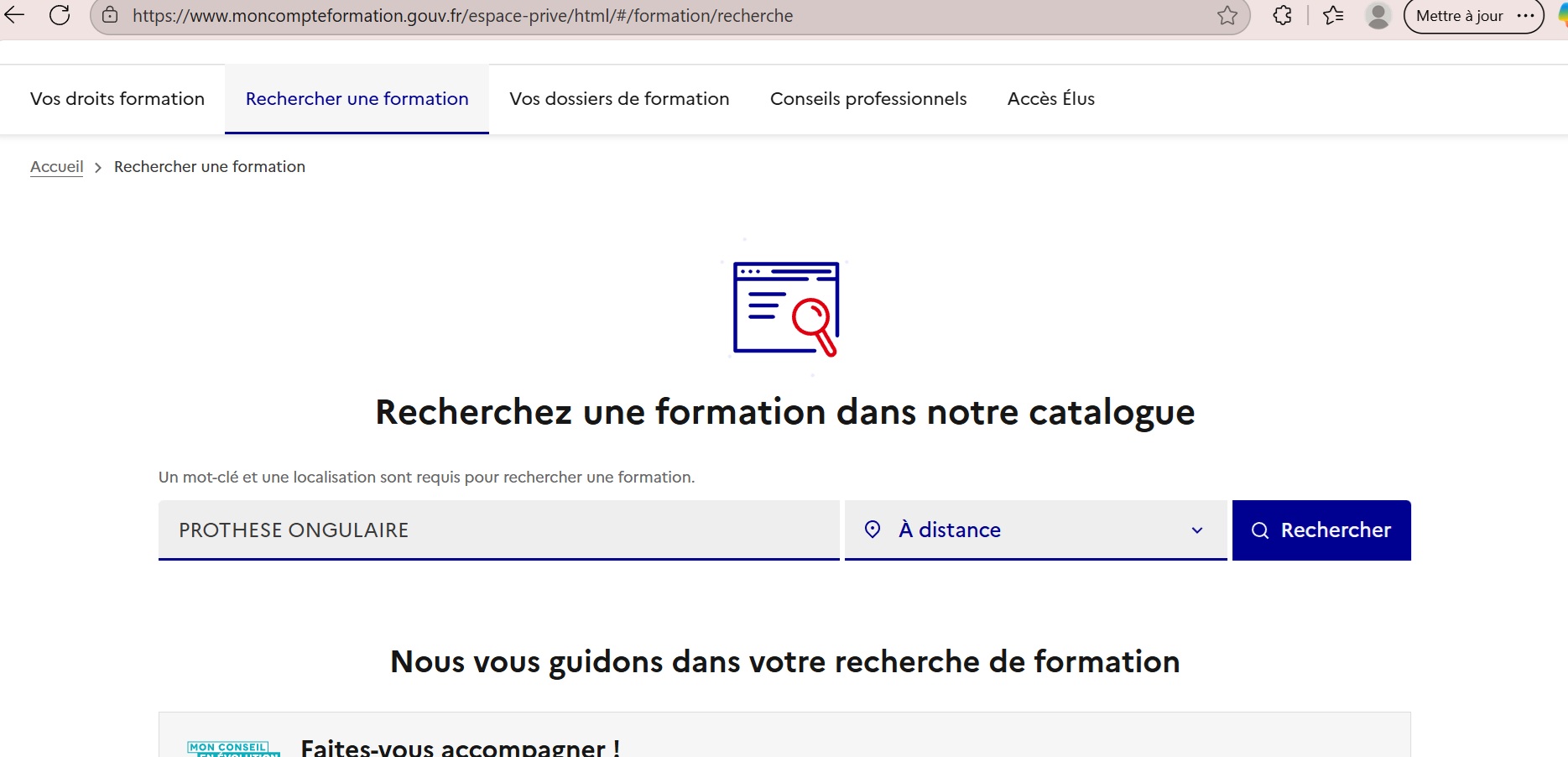 Champ de recherche : mot-clé « PROTHÈSE/PROTHÉSISTE ONGULAIRE » + filtre « À distance » → bouton « Rechercher ».
