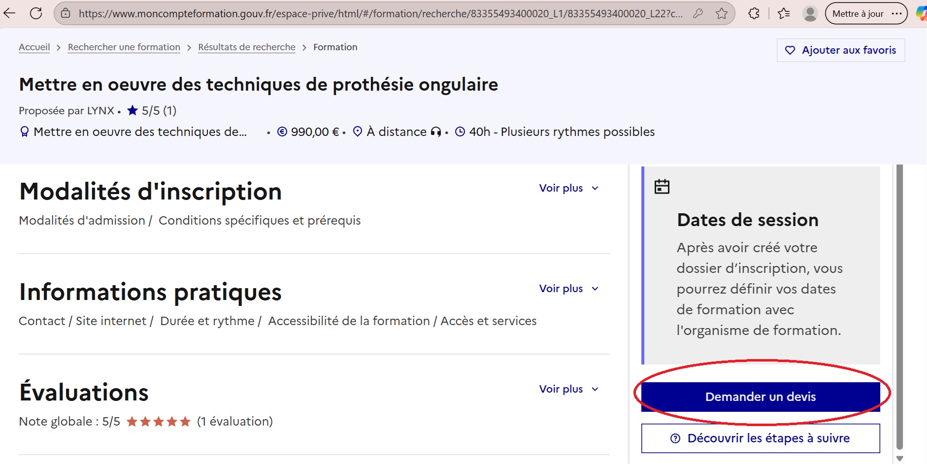 Fiche formation — bouton « Demander un devis » (créez votre dossier)